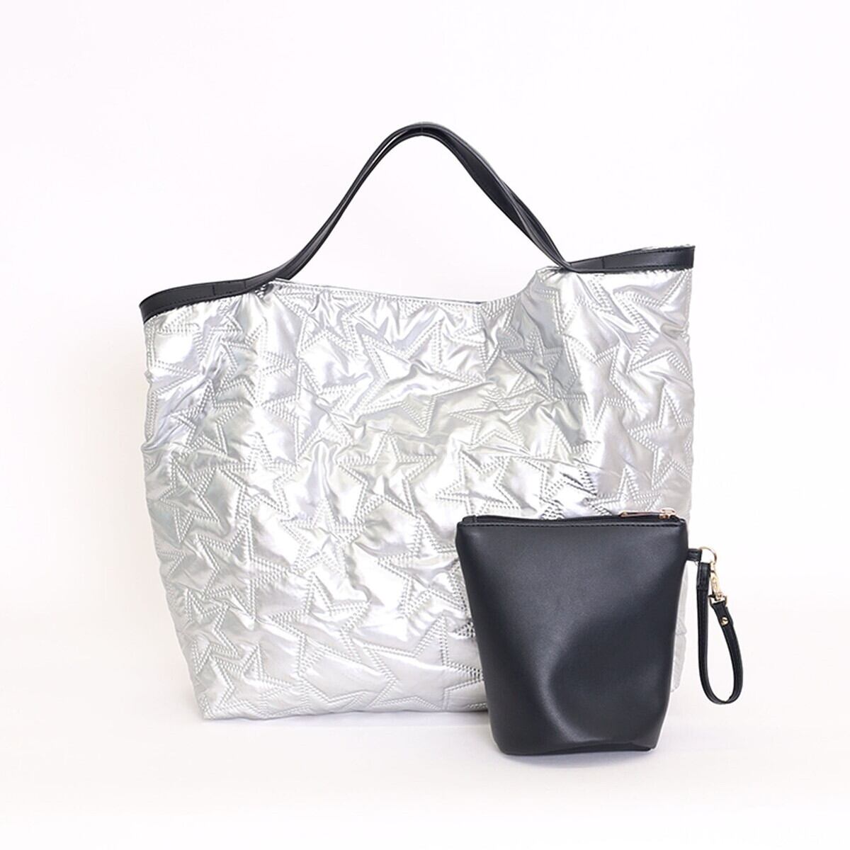 シャイニーな生地に星柄のキルティングを施したトートバッグシンプルな形ですが、